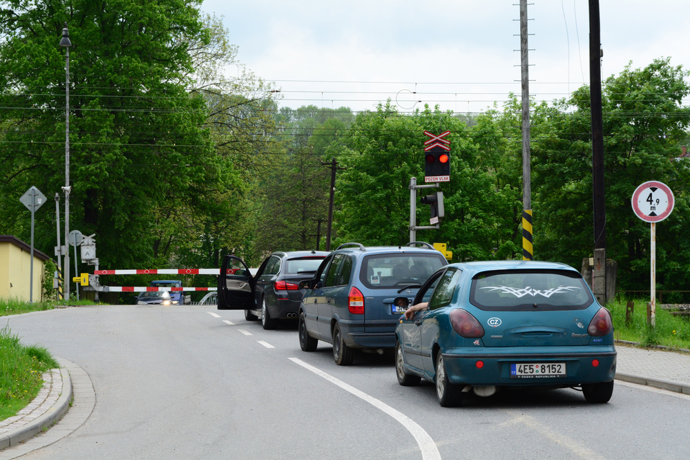 Coches cruzando vías de tren. Reductor de velocidad.